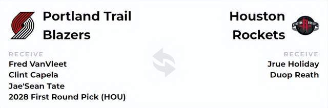 火箭送出范乔丹、卡佩拉、泰特有一个未来首轮选秀权,从开拓者得到霍勒迪和添头里斯。
