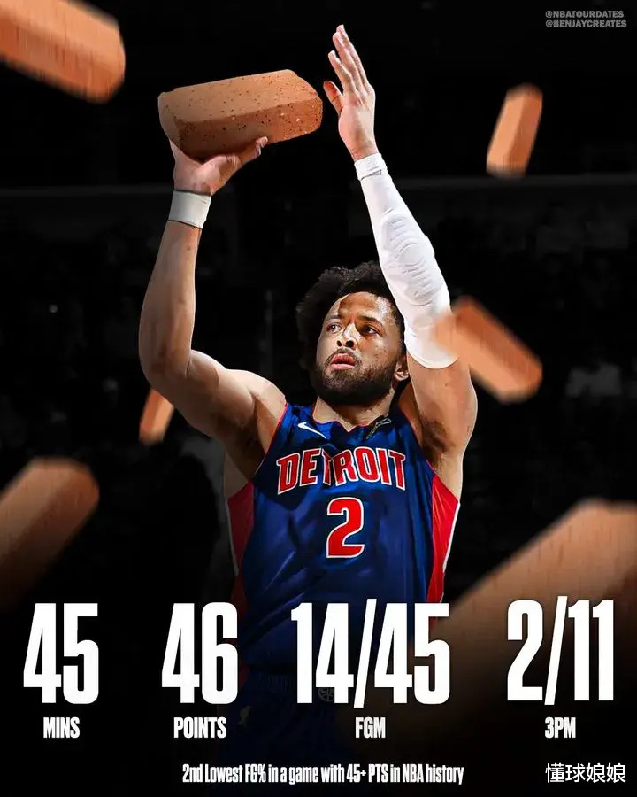 45投14中,总计投丢31个,刷新了NBA的单场打铁纪录。
