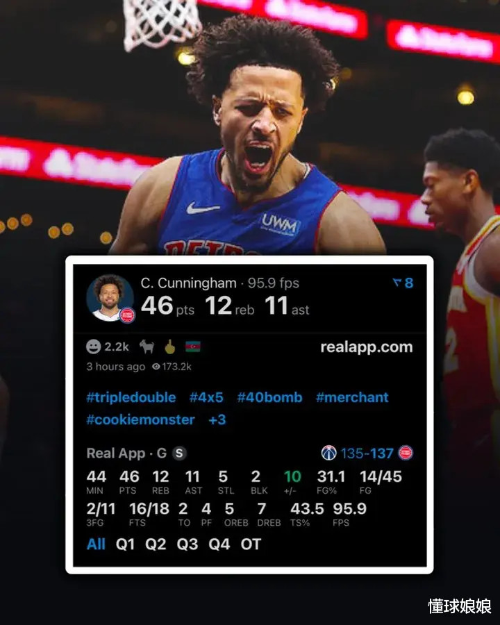 其实45投换46分,其实也不怪坎宁安,防守压力都在他身上,这个命中率挺正常的,而且46投还能保持3成以上的命中率,不低了。
