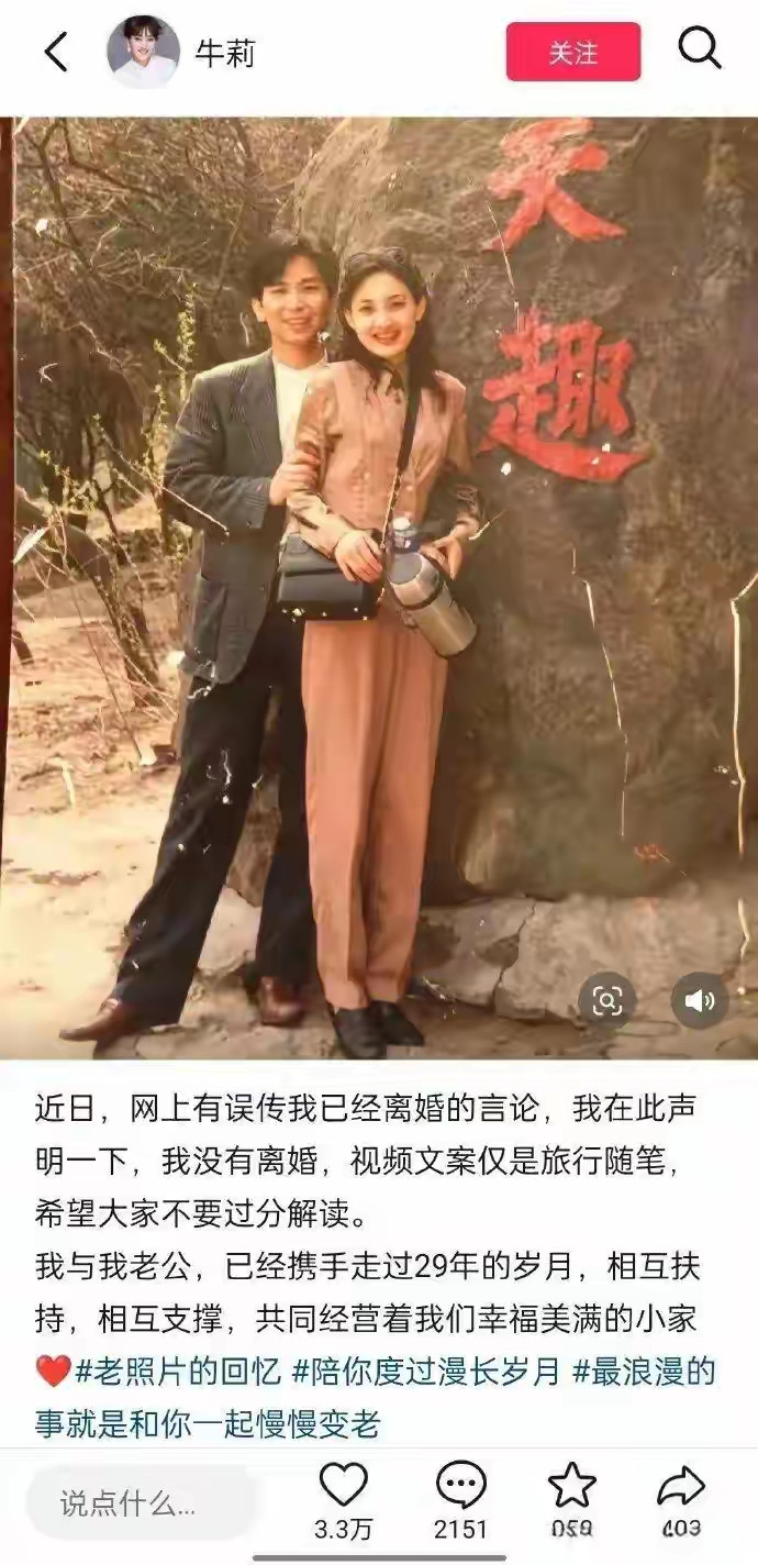 不过去年牛莉和老公刘亚东倒是传过一段时间的离婚传闻,事件发酵一段时间后,直爽的牛莉直接在自己的社交账号上辟谣没有离婚,还放出和老公年轻时候的合照。