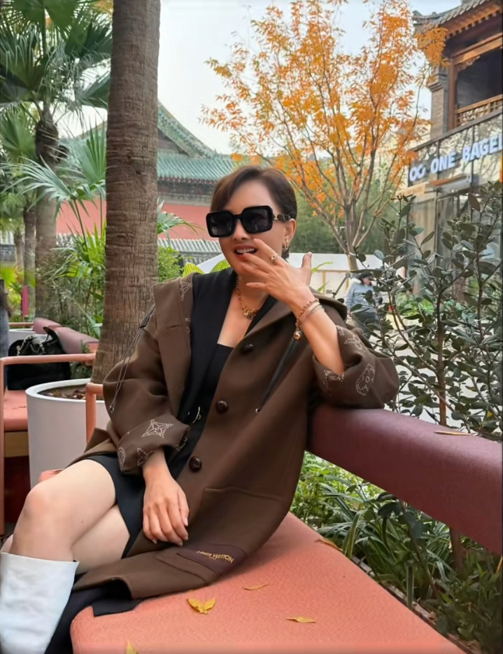 近日,牛莉晒出近照,她和朋友外出喝下午茶,打扮得那叫一个气派漂亮,低丸子头戴着墨镜,倚靠在长椅的样子很有贵妇的气质。