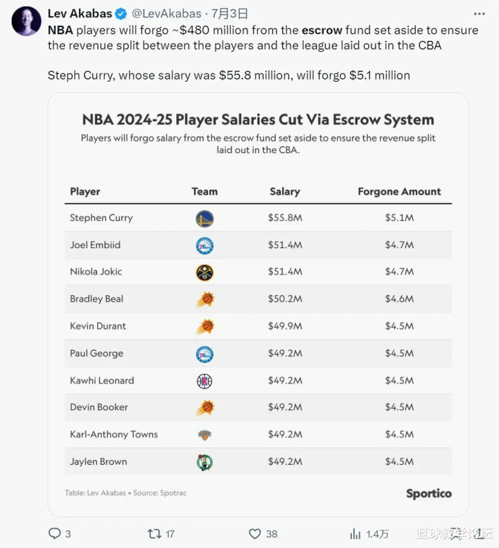 简单来说就是,球员年薪的9.1%要还给老板。年薪越高,损失越大。以2024-25赛季为例,库里年薪5580万美元联盟第一,大约损失510万美元。恩比德和约基奇年薪都是5140万美元,各损失470万美元。比尔年薪5020万美元,损失460万美元。