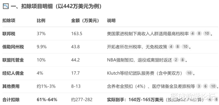 最后再给大家算一笔账,杨瀚森新秀赛季年薪442万美元,到手多少钱?开拓者所在的俄勒冈州,最高州税比例是9.9%。再扣除联邦税、经纪人抽成、联盟托管资金、联邦社保等费用之后,杨瀚森新秀赛季到手工资大约160万美元。