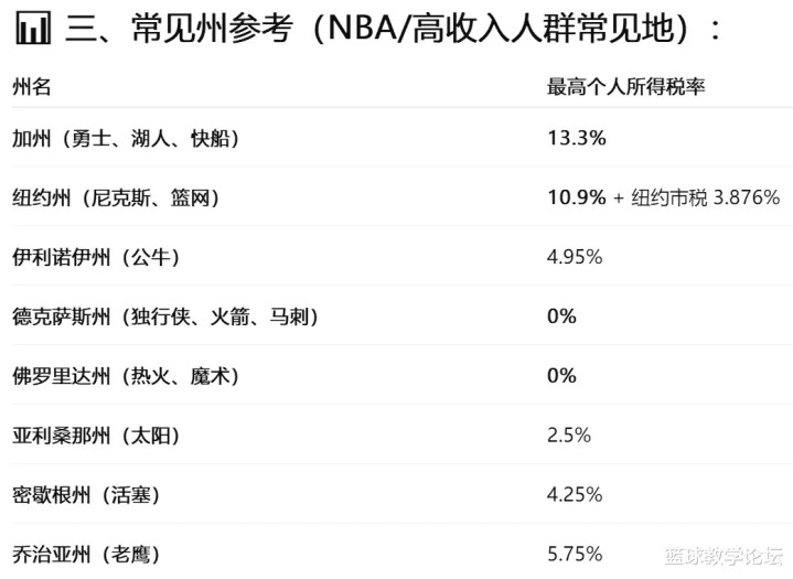 今年休赛期,芬尼-史密斯4年5300万美元加盟火箭。如果他留在湖人的话,这4年一共要缴纳705万美元的加州州税。如今去了火箭,这一大笔钱就能省下来买豪宅了。美国各州的州税不一样,加州的州税最高,可以参考下面这张图: