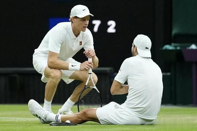 对于辛纳而言,能够打进八强算是上苍保佑了!上一轮,他在3-6、5-7连丢两盘,第三盘2-2的绝境下,竟然收到了迪米特洛夫的退赛大礼!后者在发球时拉伤胸肌,泪流满面心碎退赛的场面,也成为本届温网迄今最大的意难平!