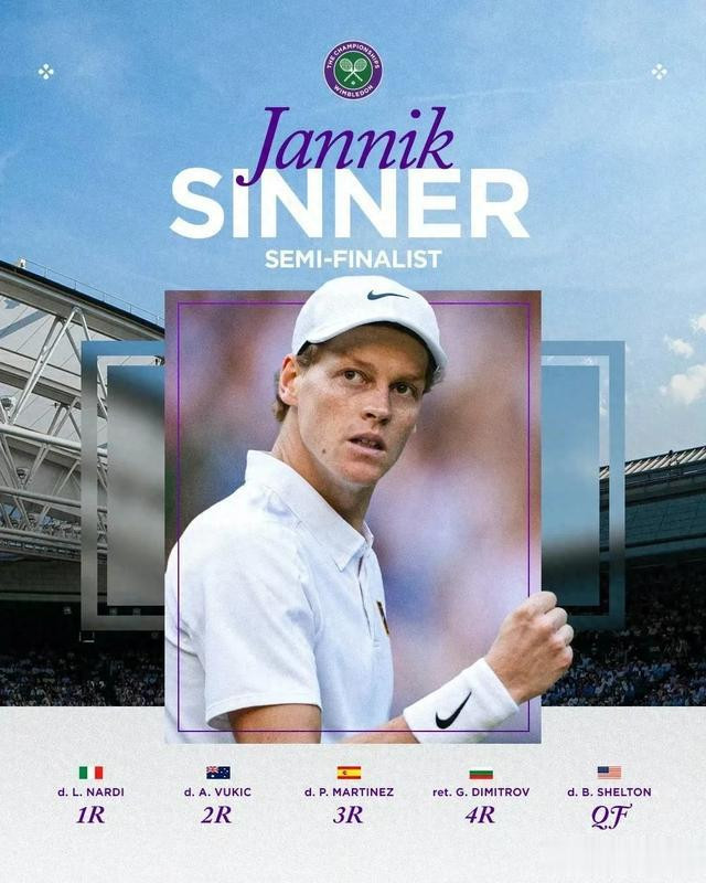 2025温网男单1/4决赛,头号种子辛纳直落三盘,以 7-6(2)、6-4、6-4 击败10号种子谢尔顿,时隔2年重返赛会四强,也打进个人职业生涯的第7个大满贯半决赛。半决赛,他将静候6号种子德约科维奇和科博利之间的胜者。