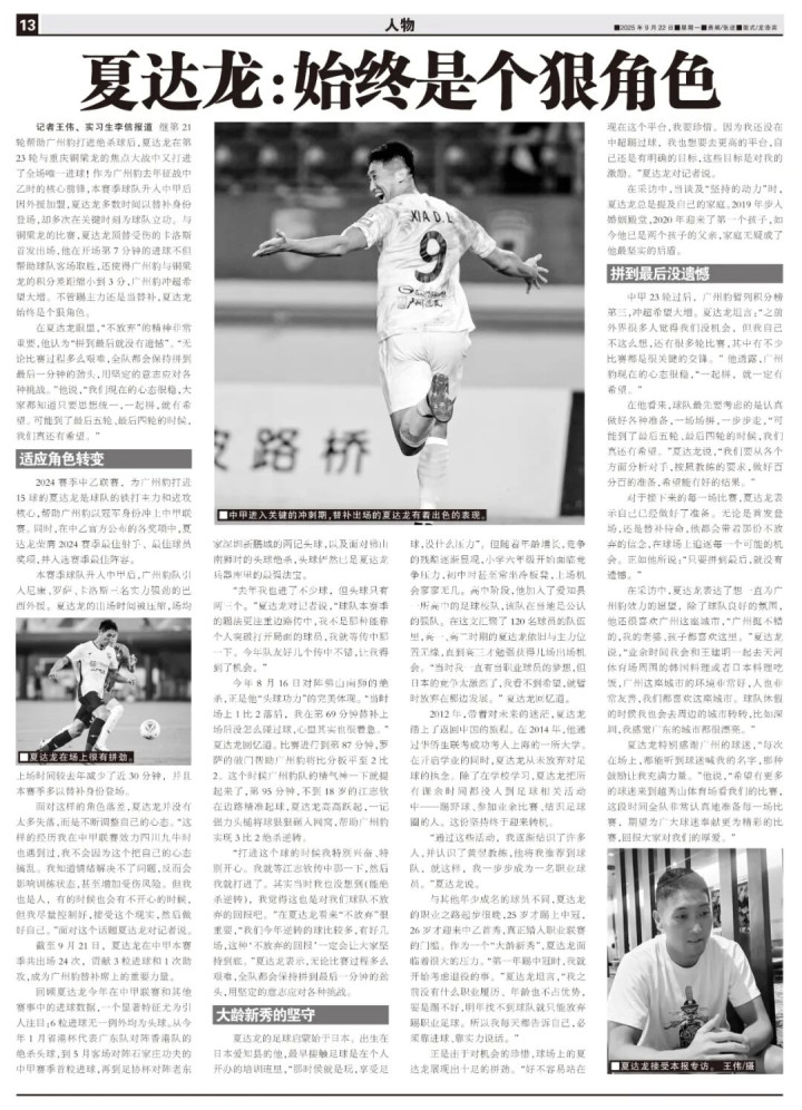 截至9月21日,夏达龙在中甲本赛季共出场24次,贡献3粒进球和1次助攻,成为广州豹替补席上的重要力量。