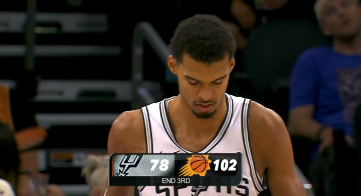 末节文班连续尝试三分均打铁不中,持球被古德温抢断,之后文班禁区上篮以及大帽伊戈达罗,空接暴扣、轰进三分继续带队反扑,握拳怒吼宣泄情绪;之后太阳7-0再次拉开分差,比赛还剩4分32秒,马刺撤下文班,由于落后太多,只能无奈地提前认输。