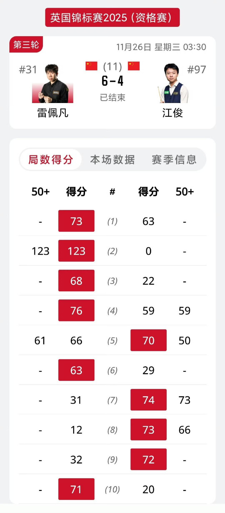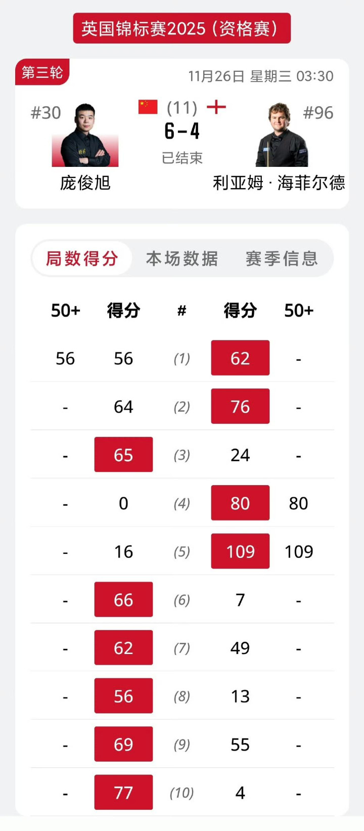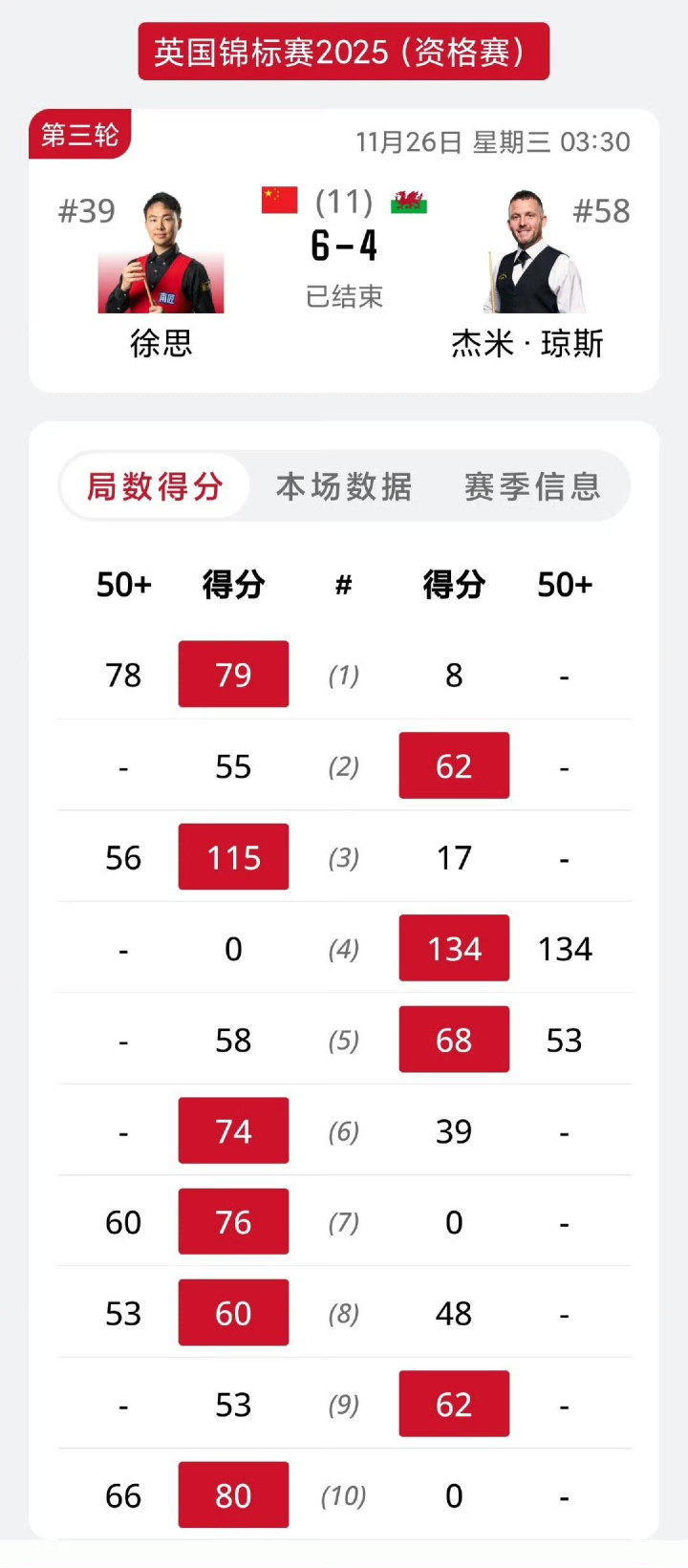 最晚结束的三场比赛,庞俊旭1-4落后连拿5局,6-4逆转利亚姆-海菲尔德;雷佩凡4-0开局遭被同胞江俊追平,最终6-4拿下;徐思6-4战胜杰米-琼斯。