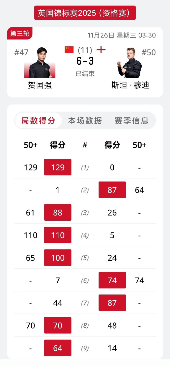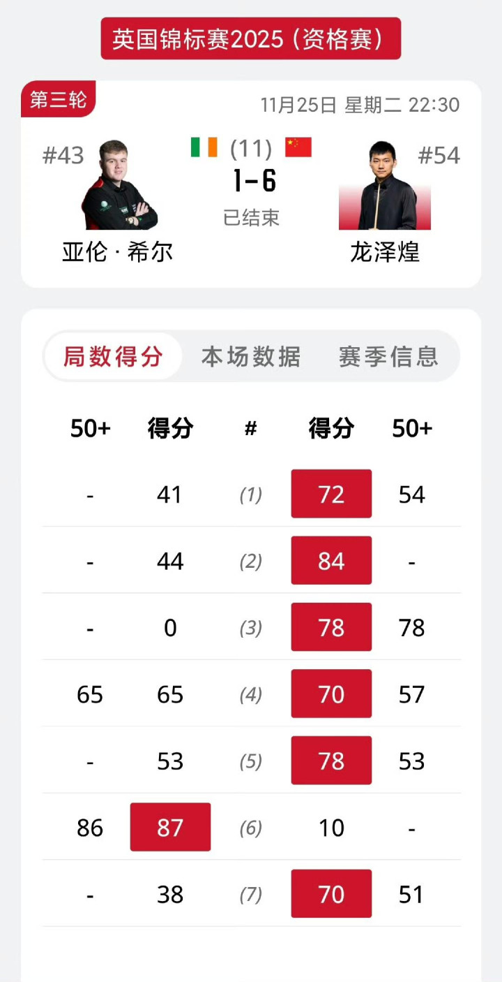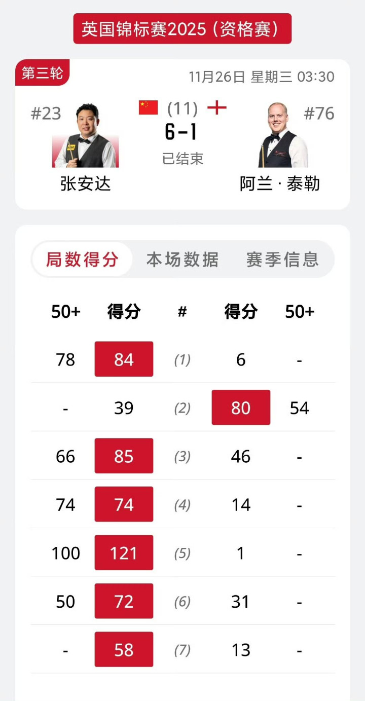 昨晚的比赛中,龙泽煌6-1击败亚伦-希尔,国强轰出两杆破百,6-3力克新星斯坦-穆迪。张安达轰出破百连拿5局,6-1轻取阿兰-泰勒。