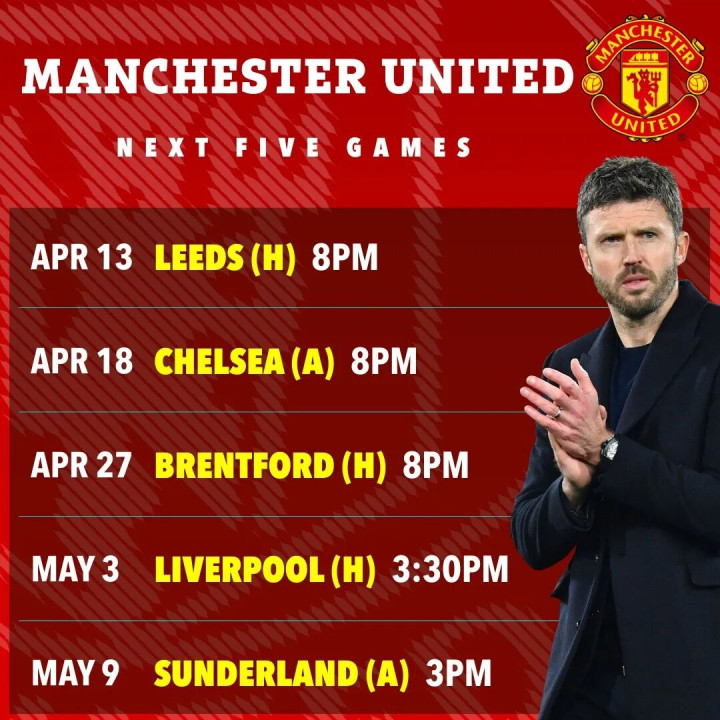 这两种情况下,曼联只需赢4场,拿到67分,就确保前五位置了。但如果切尔西拿到最高积分69分,维拉72分,利物浦67分的话,曼联就需要至少4胜1平,才能确保比对手高分,不必对比净胜球。