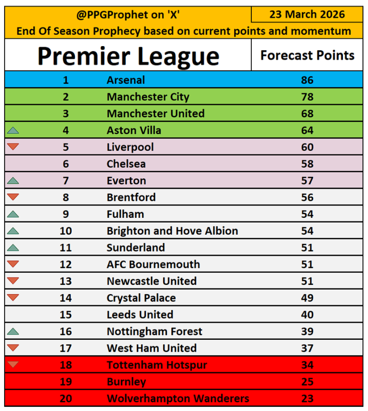 如果按照各队目前的场均积分来计算最终的联赛排名,曼联有望以68分位列第三,领先排名第四的维拉4分。利物浦将积60分排名第五,切尔西积58分排名第六。